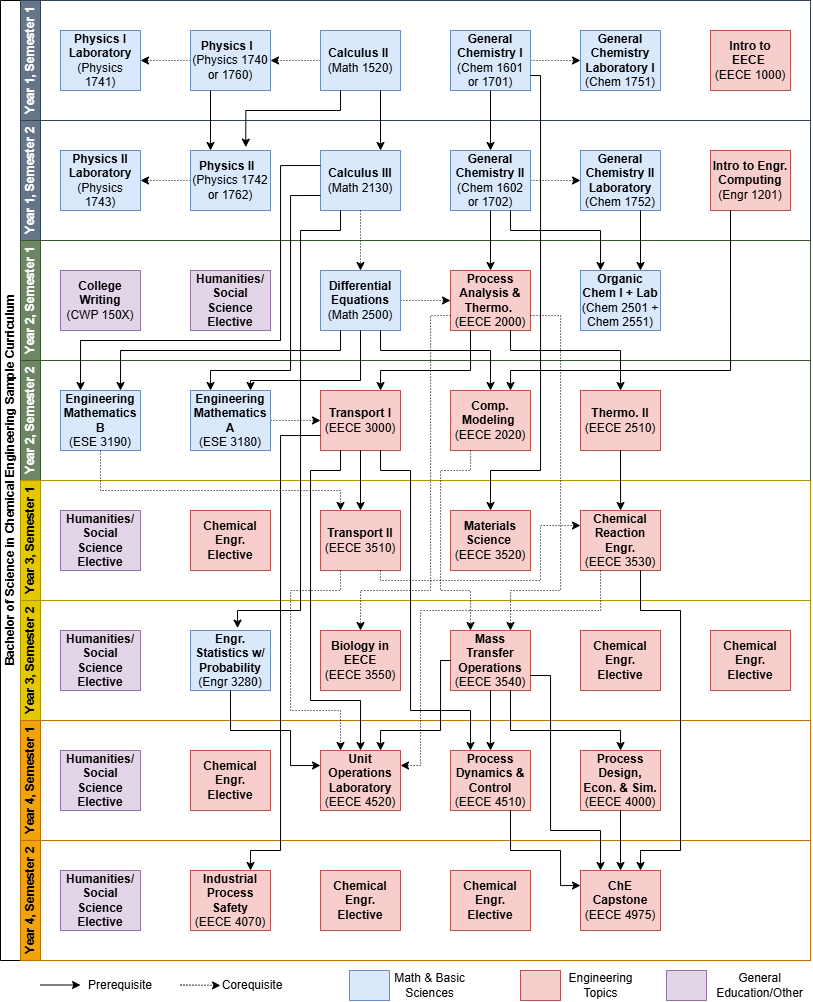 The curriculum is designed to provide opportunities for students to explore areas of interest within chemical engineering. For additional flexibility, another choice is to pursue the course of study leading to the BS degree in Applied Science with a major in chemical engineering.
